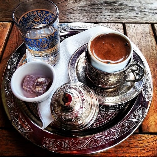 El café turco se sirve tradicionalmente con agua y delicias turcas. Se toma agua antes de tomar el café, para sentir su aroma mejor.